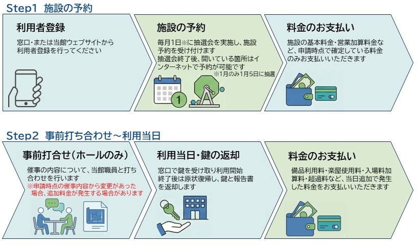 当館のご予約には、『施設予約システム』または『窓口』から、施設利用申請が必要です。